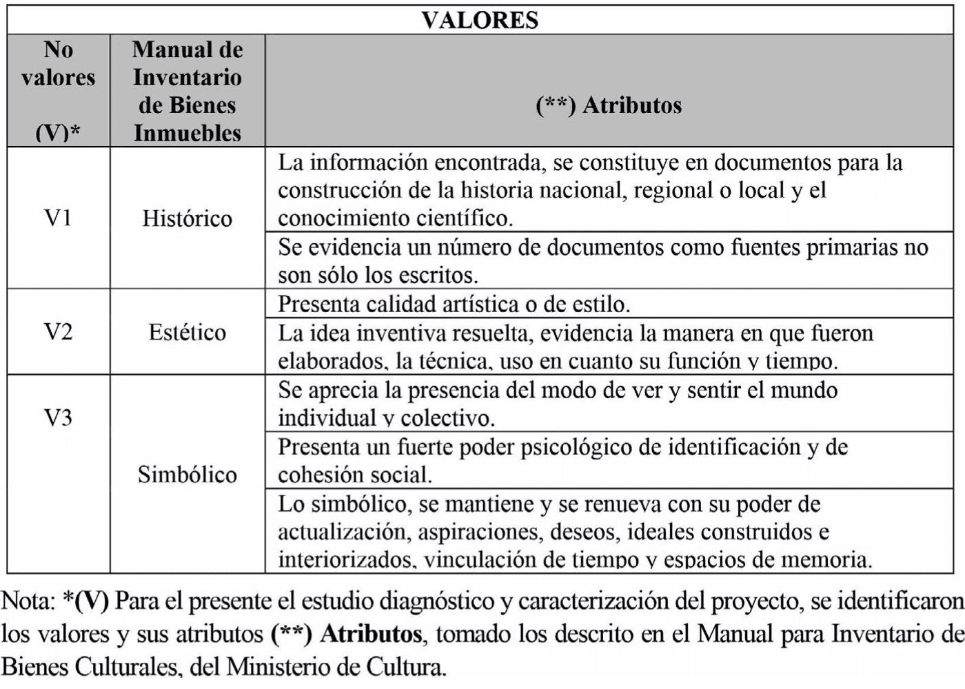 Según el Ministerio de Cultura (2005), la valoración de los BIC corresponde a la elaboración del inventario de los bienes, la cual está definida a partir de categorías como: 1) El sujeto; que hace referencia al individuo o a la colectividad; 2) El objeto; definido como arqueológico, etnográfico, documental, artístico, utilitario, científico o como un monumento en el espacio público; y 3) El contexto en el que se relacionan la comunidad, el contexto geográfico y el contexto sociocultural.