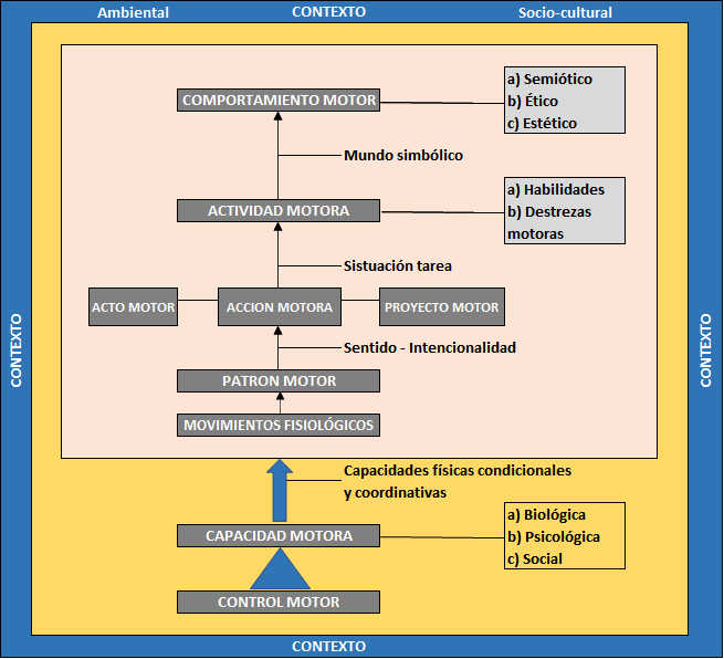 En el modelo corresponde a la acción y actividad motoras (tabla 1), dada su íntima relación con el contexto social. La primera se constituye por el entretejido de distintos patrones de movimiento, los cuales cobran sentido o intencionalidad. Es la unidad funcional de la actividad motora, por lo cual se define como el «obrar o hacer del hombre en el mundo de la vida» (Agámez et al., 2002, p. 127). A diferencia de los patrones de movimiento, la acción motora es regulada por el aprendizaje y se presenta como la manifestación objetiva de la capacidad motora (lo observable del movimiento humano). Está en estrecha relación con el acto y el proyecto motores, expuestos en el ítem 2.2.