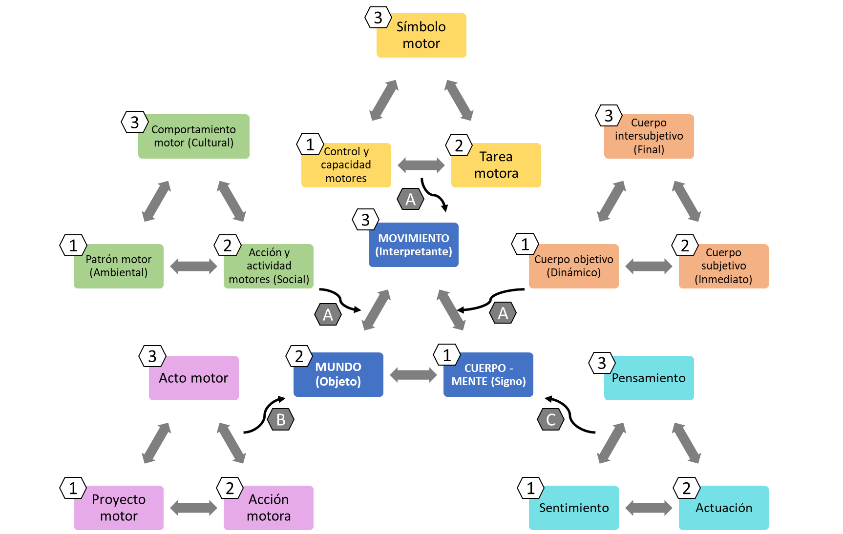 De esta manera, se analiza la diada Cuerpo-Movimiento desde la teoría del continuum, así como el modelo de MHSC-UAM desde el triángulo semiótico de Peirce. Se hará también referencia a la la teoría de las 4E en Ciencias Cognitivas (Rossi et al., 2019). Ambas teorías—MHSC-UAM y 4E—son bastante compatibles, esta última concibe el objeto de estudio de las ciencias cognitivas como el sistema cerebro/cuerpo-en-el-mundo. Por su parte, la comunidad UAM, desde una perspectiva fenomenológica, aborda el concepto de cuerpo ser en el mundo, categoría que da sentido al constructo teórico de «movimiento como sistema complejo».