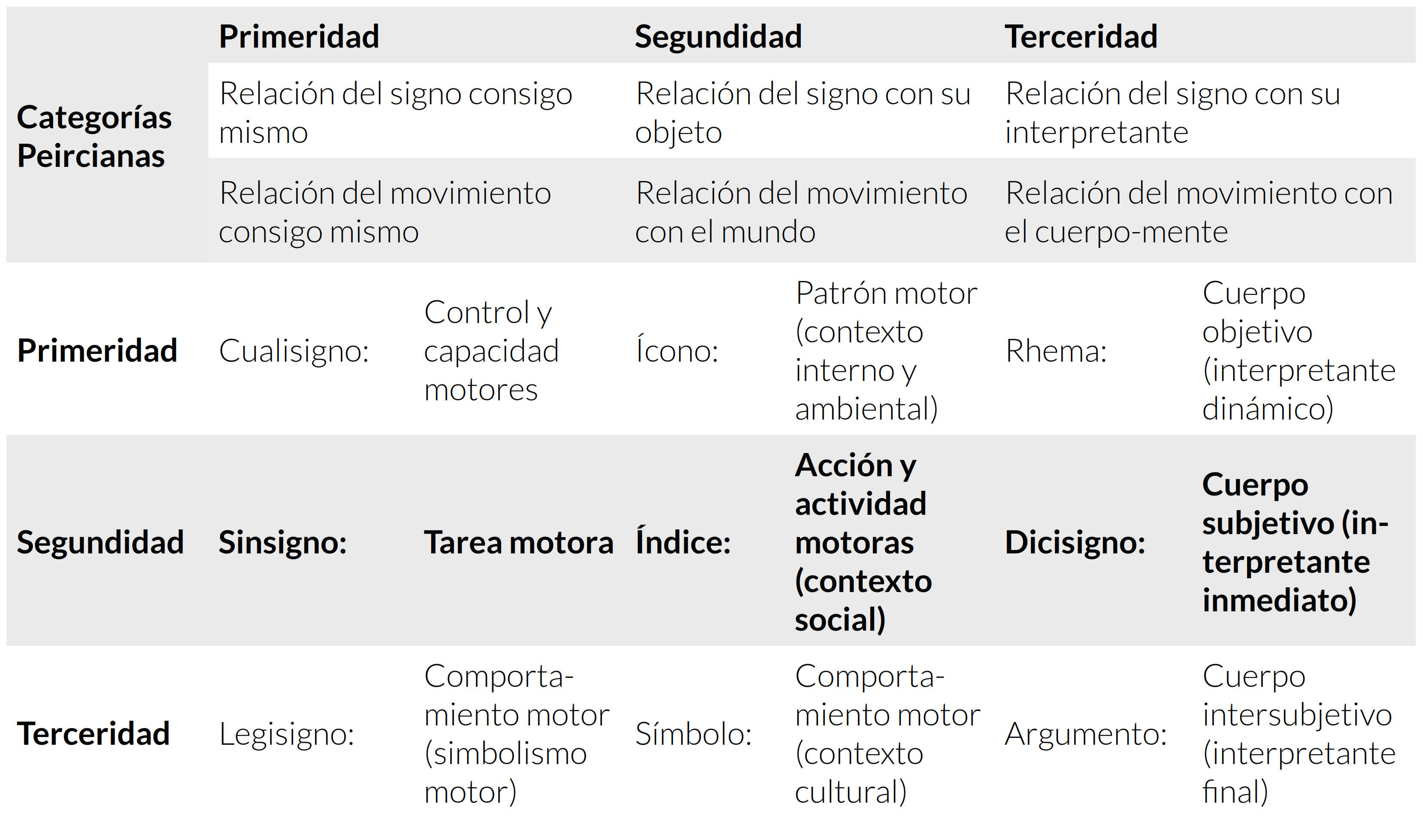En el modelo de MHSC-UAM concierne a los signos emocional, energético y lógico del movimiento corporal (tabla 2), en tanto condiciones de sentimiento, actuación y pensamiento del interpretante, valga decir, el movimiento humano, resultante de la interacción entre cuerpo-mente y mundo. En estas condiciones se resumen el control motor, la capacidad motora y lo objetivado del movimiento (patrón, acción, actividad y comportamiento motores) cargado de emociones, intencionalidades y significados en su interacción con el mundo de la vida.