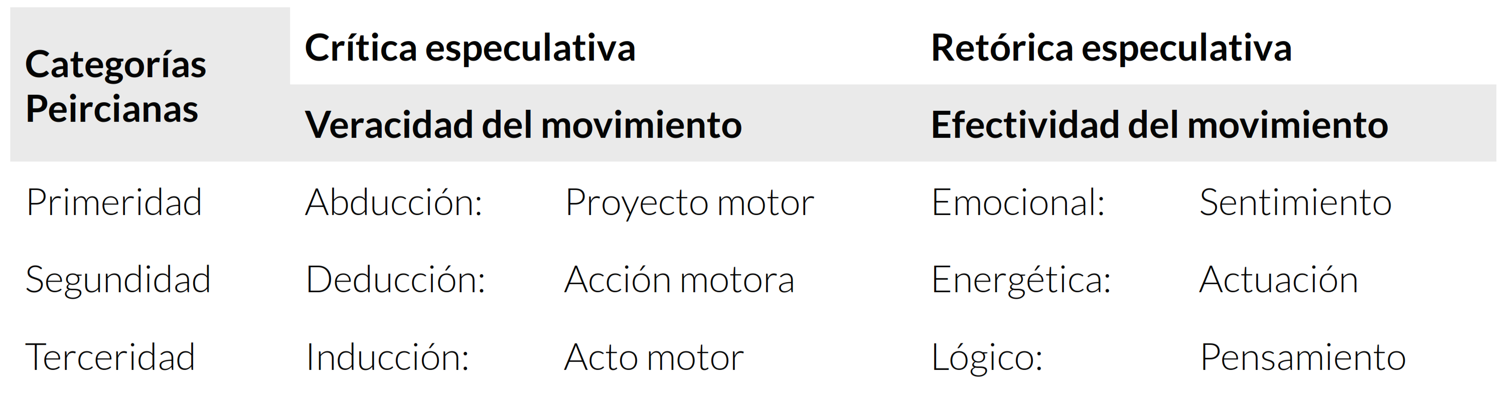 Más allá de la deducción como método para acercarse a la verdad, Peirce propone además la inducción y la abducción (Liszka, 1996). Las categorías Peircianas de ‘abducción’, ‘deducción’ e ‘inducción’ se develan en el modelo de MHSC-UAM (tabla 2) como el proyecto motor (inferencia posible de movimiento, conjetura motora), la acción motora (inferencia necesaria de movimiento, conclusión motora) y el acto motor (inferencia probable de movimiento, experiencia motora), respectivamente.