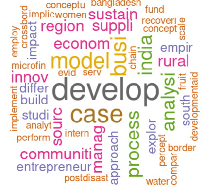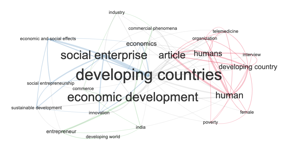En la siguiente ilustración se evidencian las palabras que tienen participación asertiva dentro del trabajo realizado, cada una de las palabras está relacionada con el desarrollo del tema («social enterprise» y «developing countries» o «economic development»). La mayoría de palabras que más han tomado fuerza dentro del escrito son: «Developing Countries», «Economic Development» y «Social Enterprise»; palabras que en esta investigación son el eje principal para el desenlace de las ES. Esta información ha sido extraída de fuentes confiables como Scopus y Bibliometrix.