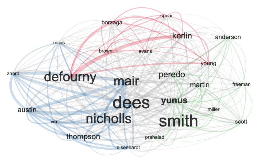 En la siguiente imagen se encuentra la relación entre autores que más aportan al tema abordado, es importante resaltar que gran parte de ellos son economistas que fundamentan el desarrollo de sus consultas, teniendo como criterio «emprendimientos de gran escala y bienestar social», considerados dentro de las ES en los países que se encuentran en la senda de crecimiento económico o en desarrollo. Yunus es un gran ejemplo, en el tema es ganador del Premio Nobel de la Paz por la creación del banco Grameen; enfocado en el apoyo a ES y desarrollo de los créditos de microfinanzas, es altamente citado en sus publicaciones ya que brinda información de interés para otros emprendedores, y tiene varios trabajos colaborativos con Smith, que también es un erudito en el área investigada.