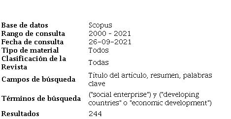 Teniendo como criterio la ES —aquella empresa sin ánimo de lucro que orienta sus excedentes hacia la reinversión, maximización de beneficios para las comunidades menos favorecidas y para el cuidado y protección del medio ambiente—, este artículo, al evidenciar vacío del conocimiento, realiza una revisión documental de la base de datos de Scopus entre el año 2000 y 2021. Por lo tanto, el objetivo es realizar un análisis bibliográfico y revisión de tendencias sobre la temática de ES de países en desarrollo; se tienen en cuenta número de publicaciones por año, países, autores, revistas y universidades, con el ánimo de revisar la importancia del tema y evolución conceptual, también la manera cómo estas empresas dinamizan los desarrollos económicos en los territorios dentro de otras temáticas emergentes.