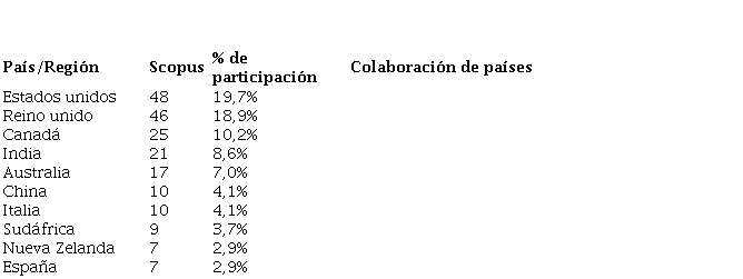 El país con el mayor número de participación —que además tiene influencia sobre otros países— es el Reino Unido, una nación compuesta por cuatro países (Inglaterra, Escocia, Gales e Irlanda del Norte); y tenemos a USA con una participación algo superior a la del Reino Unido. Entre los dos se obtiene información relevante para el desarrollo del tema: EEUU aporta un 19,7% de artículos y Reino Unido 18,8%, así los dos proporcionan un 38,5% del tema a nivel general. Esta información está correlacionada con los autores y universidades que también aportan en la creación y evolución de los estudios realizados, lo más llamativo es que los países con mayor desarrollo económico son los más interesados en el tema de ES; lo cual nos lleva a concluir que gran parte de sus evolutivos se deben a un trabajo crítico que han realizado mediante el desarrollo social colectivo, pero también, en el hecho de que es en estos países donde se generan mayores posibilidades para financiar este tipo de iniciativas.