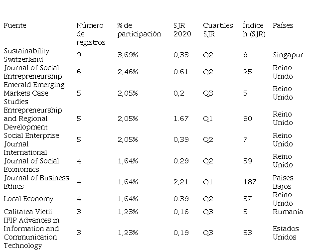 De los países con mayor participación en el tema, se evidencia que EEUU y Gran Bretaña aportan un significativo número de documentos con una tasa de participación de 19,7% y 18,9% respectivamente. Lo llamativo es que son países desarrollados que valoran la importancia de las ES para el crecimiento económico en cualquier país, de este mismo modo se establece que cuentan con las revistas más importantes en cuanto al tema en referencia y sus autores contribuyen al conocimiento teórico. Esto demuestra sensibilidad por estas temáticas, lo que tiene una estrecha relación con el cumplimiento de los ODS; directamente en temas de pobreza, alimentación, salud, educación, equidad de género, agua potable y saneamiento, reducción de desigualdades, empleo, consumo responsable y, en general, temas asociados a la solución de problemas medioambientales.