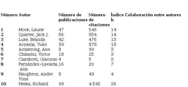 Se realizó un análisis de los autores que tienen mayores publicaciones sobre ES en países que se encuentran en desarrollo, la mayoría de estos autores son economistas con diversas publicaciones enfocadas en ciencias sociales. Esto conlleva a ver que sus publicaciones y diferentes investigaciones las realizan analizando la situación económica y social de estos países. Entre los autores relevantes están Aoyama Yuko, Mook Laurie y Heeks Richard; los dos primeros son autores estadounidenses y el siguiente es británico. Sus dos economías son muy fuertes, pero tienen en común que, en un principio, para poder llevar estos países a un desarrollo económico alto, lo realizaron con ES y cooperativas; lo cual implica un desarrollo rápido y que a toda escala se suplan las necesidades de comunidades que quieren crecer juntas.