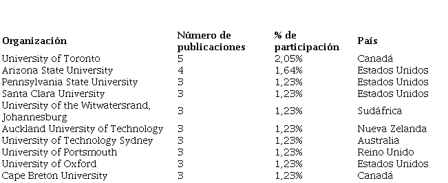 En la siguiente tabla se ilustra la participación por universidades que publican en Scopus sobre el tema abordado. Como se puede observar, hay similitud en las publicaciones de las diversas universidades, con un rango que oscila entre 3 y 5 archivos con un % de participación no superior al 3%. A pesar de la semejanza, en sus datos estadísticos sí se logró evidenciar una diferencia en la publicidad por universidad; EEUU se encuentra con una participación del 40%, superior a los demás países que difícilmente alcanzan el 20% de participación.
