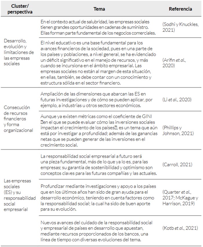 Para concluir, se evidencian en las perspectivas tres áreas fundamentales para que las empresas sociales puedan integrarse, crecer, permanecer y obtener la sostenibilidad para cumplir con su objeto social. En un primer momento se centran en la búsqueda de oportunidades, en qué sector específico de la economía y región pueden desarrollarse cumpliendo con los objetivos trazados; en segundo lugar la consecución de los recursos, ya escasos de por sí, la realizan buscando apoyos filantrópicos y gubernamentales; y por último, su objeto económico. Esto debido a que estas empresas, en su mayoría, son híbridas con un papel comercial y atrayentes a los clientes por su razón social —su manera organizativa es crucial para no caer en la corrupción, tan criticada en todos los niveles de la sociedad—; son modelos a seguir por las diferentes empresas, tanto públicas como privadas, que quieren mostrarse o convertirse en empresas socialmente responsables por su importancia en la economía actual y que se prevé que, en miras al futuro, los diferentes temas como responsabilidad social empresarial van adquiriendo la relevancia que merecen.