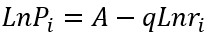 Partiendo del principio de rango–tamaño, y a través de un ejercicio de regresión lineal univariado, se estima el parámetro q; que constituye un indicador de desigualdad de tamaño por población de las ciudades, la cual resulta más pronunciada entre mayor sea su valor absoluto. Para ello se linealiza la ecuación 1 a través de la toma de logaritmo natural a ambos lados de la misma, transformándola en la ecuación 21: