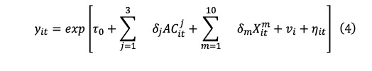 Donde . es la variable endógena de recuento, y exp es la función exponencial. Una vez linealizado, el modelo es estimado por máxima verosimilitud. Las variables explicativas están divididas entre aquellas que provienen del análisis de Abrahms y Conrad (2017); las cuales son denotadas por