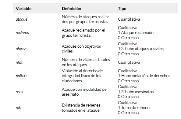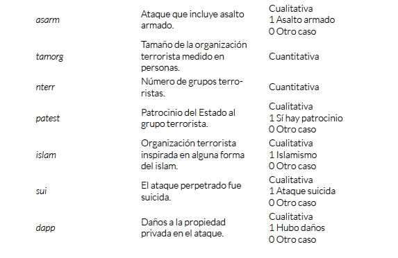 , las variables dicotómicas asumen el valor de 1 si el evento o característica tiene lugar, si no es el caso, asumen el valor de 0. Las variables que incluye este vector son los ataques contra civiles (objciv), el número de víctimas fatales (nfat), el alto grado de violación al derecho de integridad física de sus ciudadanos (polterr), asesinatos (ases), toma de rehenes en el ataque (reh), asaltos armados (asarm), tamaño del grupo terrorista (tamorg), número de grupos terroristas (nterr), apoyo del gobierno al grupo (patest), inspiración en la religión islámica del grupo atacante (islam), ataques suicidas (sui) y, como se mencionó anteriormente, ahora se incluye la presencia de daños a la propiedad privada en el ataque (dapp).