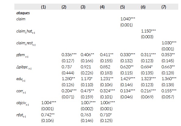 La segunda forma funcional -columna 2- incorpora las variables provenientes de la teoría del número de ataques que también tienen una alta significancia estadística. A pesar de que el crecimiento económico per cápita (Δpibpc) no es estadísticamente significativo, la participación femenina (pfem), el gasto en educación (edu) y la corrupción (corr) sí lo son y los signos son los esperados.