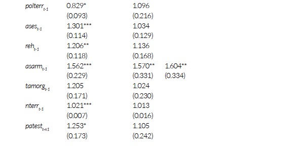 De forma específica, los resultados muestran, en la primera columna, que todas las variables del modelo que determinan los reclamos (Abrahams y Conrad, 2017) explican el número de ataques terroristas acaecidos en un país por año, a excepción del tamaño de la organización terrorista (tamorg), la religión islámica (islam) y los ataques suicidas (sui). Específicamente, las variables de mayor incidencia son los asaltos armados (asarm), los asesinatos (ases), el patrocinio del Estado (patest) y la toma de rehenes (reh) porque superan la unidad. En este sentido, si en el pasado se han presentado asaltos armados a cargo de grupos terroristas, el riesgo de ataque se incrementa en 1.6 veces con respecto a aquellos países que no lo han presentado.