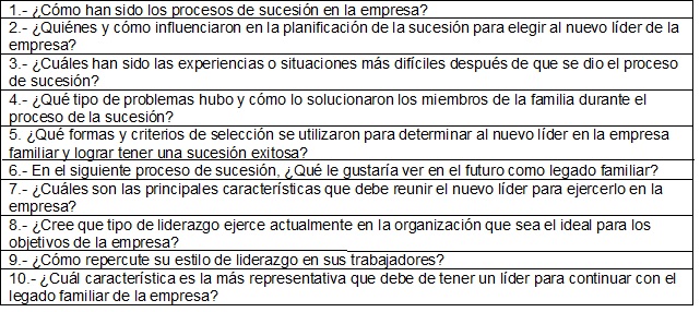 La parte inicial del estudio consistió en la búsqueda documental de artículos científicos relacionados con las variables de estudio, tanto teóricos como empíricos. Posteriormente se analizaron los artículos encontrados, seleccionando solo aquellos que anexaban un instrumento, (guía de entrevista o cuestionario) que se tomarían como base para diseñar una guía de entrevista definitiva. Se obtuvieron un total de 33 artículos, eligiendo dos instrumentos relacionados a estudios similares de sucesión y liderazgo dentro de EF, de los autores Rodríguez y Camacho (2010) y Manning (2013). Se elaboró la guía de preguntas con base en los anteriores artículos, tal como se muestra en la Tabla N° 1.