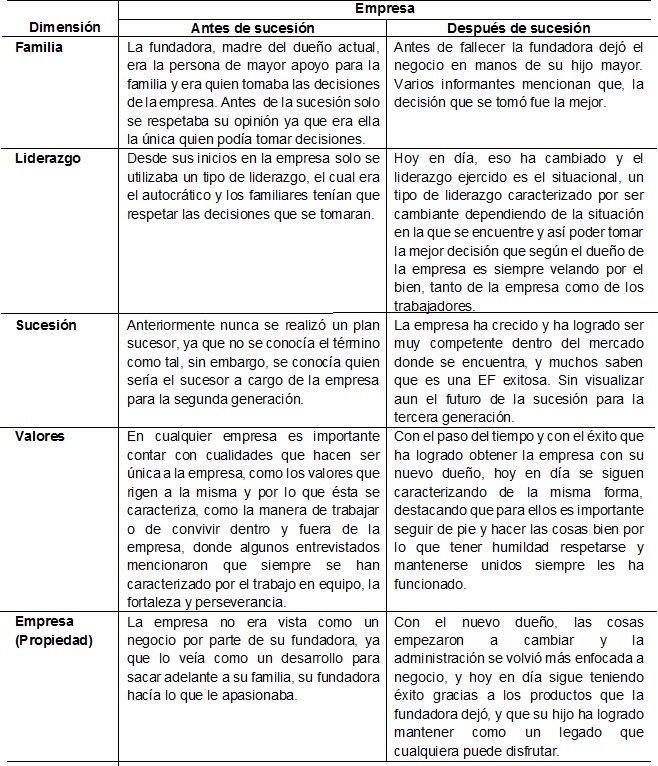 De las dimensiones estudiadas en la investigación tomando como eje conductor el proceso sucesorio, se analiza cada una de ellas en cuestión temporal antes y después de dicho proceso, tal como se muestra en la Tabla N° 2.