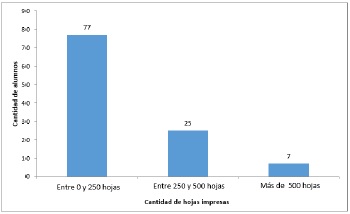 Comparando el gráfico de hojas impresas y de hojas fotocopiadas, se observa que los alumnos que respondieron la encuesta fotocopian más que lo que imprimen en impresoras personales. Por lo tanto, los esfuerzos para disminuir el impacto ambiental de consumo de papel deben estar puestos en que se fotocopie sólo lo necesario.