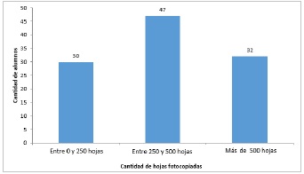 Con respecto al uso de fotocopias, los alumnos encuestados indicaron que en un 43% utilizan entre 250 y 500 hojas, un 29% más de 500 hojas fotocopiadas y un 28% entre 0 y 250 hojas fotocopiadas.