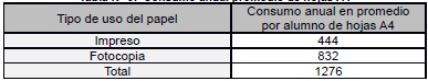 De esta forma se calcula en base a los resultados de la encuesta los siguientes consumos promedios de papel por alumno: 222 hojas de papel impreso en un cuatrimestre, por lo que anualmente consideramos que consume el doble (dos cuatrimestres): 444 hojas A4 impresas anualmente. Con respecto a las hojas fotocopiadas por alumno en un cuatrimestre en promedio: 416 hojas fotocopiadas en un cuatrimestre, por lo que anualmente consideramos que consume el doble (dos cuatrimestres): 832 hojas A4 fotocopiadas en un año.