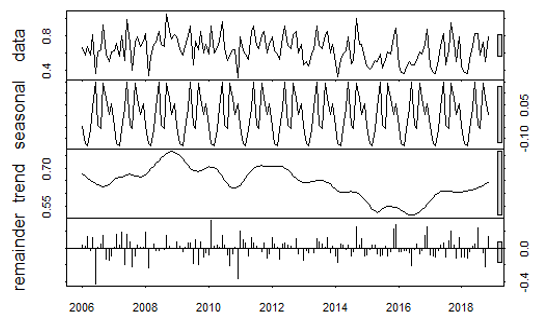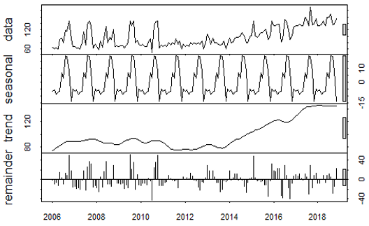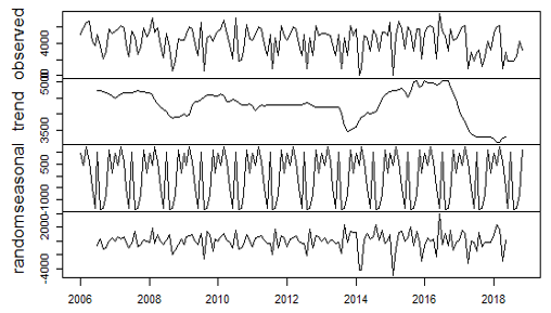When decomposing the time series for the analysis of trend and seasonality, a graph is presented containing each component of the series, obtained by means of the method of moving averages provided by the mathematical assistant R. Figure 3 shows the values observed, the seasonal component, the trend and the residuals.
