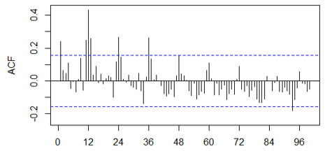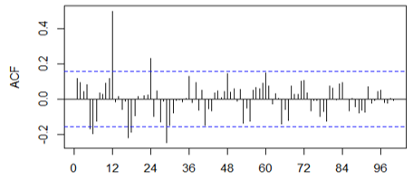 The correlogram of the series, figure 10, allows us to verify that there is a predominance of the seasonal component, evidenced by the presence of a relative maximum for delay 12; in addition to the trend component being present, but to a lesser degree as the values of the autocorrelation function go from positive to negative.