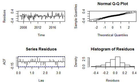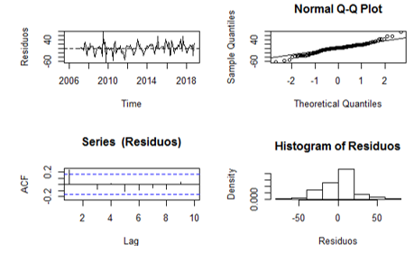 The graphic representation of the residuals confirms the fulfillment of the basic assumptions, this allows to affirm that the model selected for the prediction has the adequate quality as shown in figure 11.