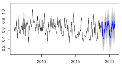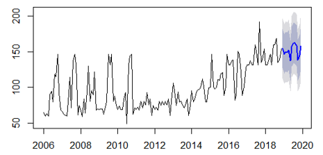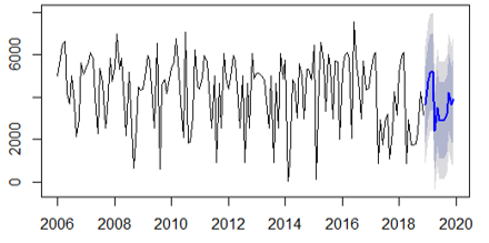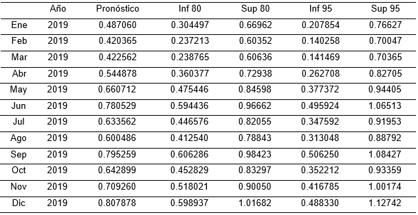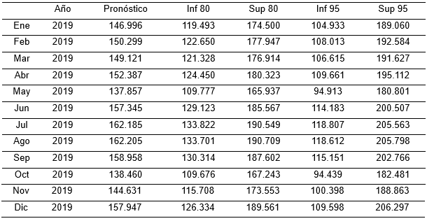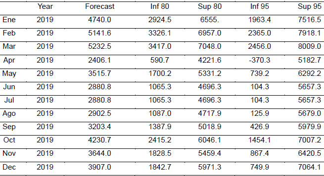 From R's forecast library, the prediction for the year 2019 is formed, as well as the estimate by intervals for a reliability of 80 and 95%. The results are shown in the table below.