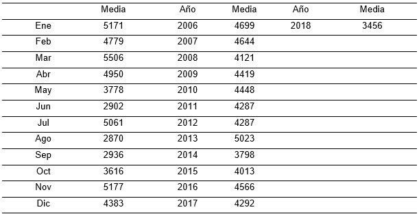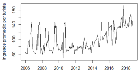 After analyzing the tourist demand and cost per dollar series, it is necessary to analyze the efficiency indicator: average monthly income per tourist, an element of great importance for any organization. Therefore, the time series is studied below, from 2006 to 2018 represented in figure 13.