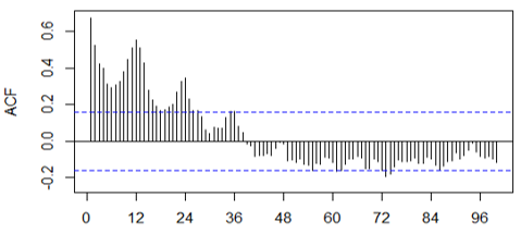 The observation of the correlogram of figure 15 shows that the predominant component is the trend, since the autocorrelation values go from positive to negative values as illustrated in the figure; However, the seasonal component is also present as it is evident that the autocorrelations present a relative maximum with period 12.