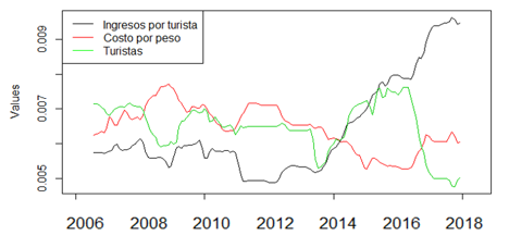 This allows us to appreciate the relationship between the three elements taken as the object of study: tourist demand, cost per dollar and average income per tourist.