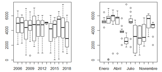 In the box graphs, it can be seen that the years with the highest peaks were 2006, 2007, 2013 and 2016. In 2013, the highest number of tourist visitors occurred with low variability and the decrease is corroborated as of 2017 (figure 4a).