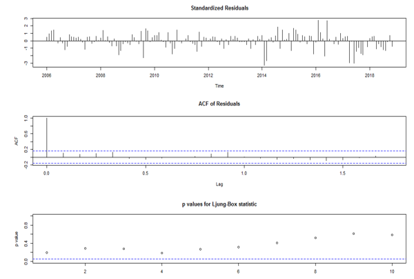 To validate the model, the Ljung-Box-Pierce test is performed, also known as the portmanteau test. The null hypothesis is that the first autocorrelations are null. The result in table 3 implies that the correlations are equal to zero and, therefore, it can be assumed that the residuals behave like white noise.