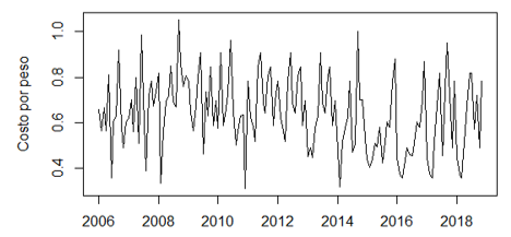 The characteristics shown by the cost per dollar series cause the decomposition method used to be the local polynomial regression adjustment (Loess for its acronym in English).