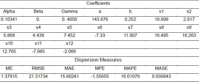 The model estimated by the automatic Holt-Winters function of R, which minimizes the dispersion function, is the one that comprises the parameters with values of 0.0727, 0.054 and 0.3693 for alpha, beta and gamma respectively. It is corroborated that in this model the component with the greatest weight for prediction is seasonality (gamma = 0.3693).