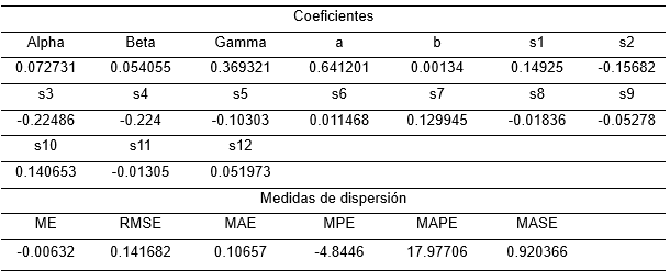 Based on the characteristics of the cost per dollar series, the Holt-Winters smoothing was used as a forecasting tool, since it is used with series that present trend and seasonality. As Castillo (2017) well explains when determining that in time series with this type of characteristic, exponential smoothing minimizes the measurements referring to error. The tool depends on the alpha, beta and gamma parameters. This method provides the dispersion measures for each model obtained, being selected the one that presents the minimum values of variability as shown in table 5, obtained from the software output.