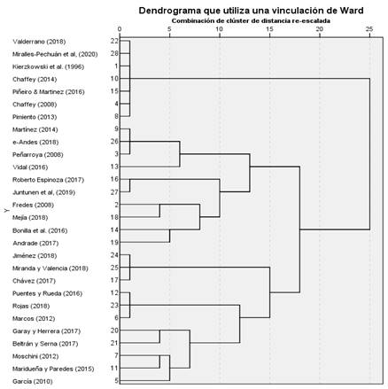 For the analysis of the bibliographies that address the management of digital marketing, a conglomerate study was carried out. To make the groups, the four components of digital marketing (flow, functionality, feedback and loyalty), the application of these studies to the tourism sector and the proposal of tools, strategies or models for their application were taken into account as variables. The conglomerate was carried out by observations through SPSS version 20 and the WARD method was used, square Euclidean distance, and level 7 was taken as the cutoff line, with which the dendrogram that can be seen in Figure 1 was obtained, identifying seven groups of authors whose main contributions and shortcomings were analyzed.