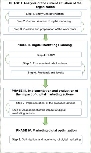 In step number two, different actions are proposed to implement or correct the functionality of our digital tools. This stage mainly uses the corporate website and search engine optimization. While in the third step e-commerce tasks are included in its two fundamental areas, B2C and B2B. Finally, it is proposed to monitor the mentions of the organization, customer service on social networks and corporate website and implement an email marketing system that favors feedback and customer loyalty.