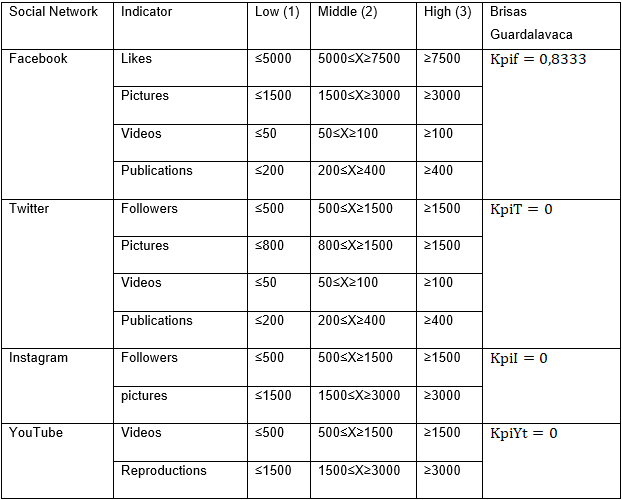 For the evaluation of social networks, the elements shown in Table 1 were taken into account.