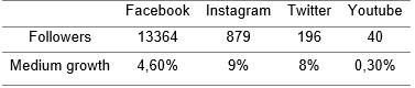 The institutional profiles were created and put into operation in the four social networks most used by the installation's target market. The increase in organic fans could only be analyzed in the social network Facebook, since it is the only one in which a hotel page was found before carrying out the marketing actions. The growth in this network in the period in which the actions were applied was 5,579 for a monthly growth rate of 4.6%, as shown in Table 2.