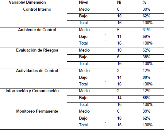 Se identificó que el nivel de control interno se encuentra en un nivel bajo con un porcentaje 62% y 38% en un nivel medio a nivel de la variable, lo que significa que la empresa no está desarrollando correctamente el control de sus actividades, así mismo los niveles más bajos se encuentran en los componentes de actividades de control e Información y comunicación en 88% nivel bajo y 12% en nivel medio, seguidamente de Ambiente de control, monitoreo permanente y evaluación de riesgos, en niveles bajos, esto se debe a la falta de mayor énfasis de parte de la gerencia para el cumplimiento y la ejecución del controles internos, existen falencias en cuanto a las asignaciones de sus funciones, es por ello que toda organización debe implementar un control interno de acuerdo al tamaño de la empresa y las operaciones que esta realiza, de tal forma que permitirá a mejorar los procesos de información en tiempo real y oportuno, pues así se evitaran y ayudarán a minimizar los riesgos.