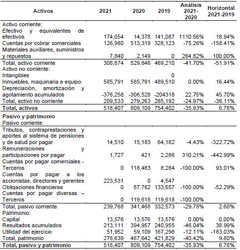 El análisis horizontal del Estado de Situación Financiera del año 2019 al 2021 , se observa un aumento significativo en el periodo 2021 respecto al 2020 de S/ 14,738.00 a S/ 174,054.00, un aumento de S/159,676.00 que representa un aumento de 1110.56% de efectivo y equivalente de efectivo; esto se debe a que los cuentas por cobrar comerciales del periodo anterior fueron cancelados y que género la disminución S/ 513,319 a S/126,980, que representa un -75.26% respecto al año 2020; de la misma manera se observa un aumento en materiales auxiliares, suministros y repuestos con el fin de incrementar el nivel de ventas, en un 264.82%; con respecto al año 2020; en cuanto a la Inmuebles, maquinaria e equipos se observa una disminución en -24.7% esto quiere decir que no renovaron nuevas adquisiciones para el siguiente año, como resultado en total activos disminuyó para el año 2021 en menos un 35.93%; y en cuanto al pasivo y patrimonio se realiza un pago a los accionistas en el periodo 2021, S/ 223.531; y esto como resultado en total de pasivo y patrimonio disminuyó en -35.93% respecto al año 2020. Se determina que la falta de control interno eficiente no se logró a los resultados esperados, lo que se evidencia una disminución de S/7,152, que vienes ser - 12.11% de utilidad que obtuvo en el periodo 2021, comparado al periodo 2020.