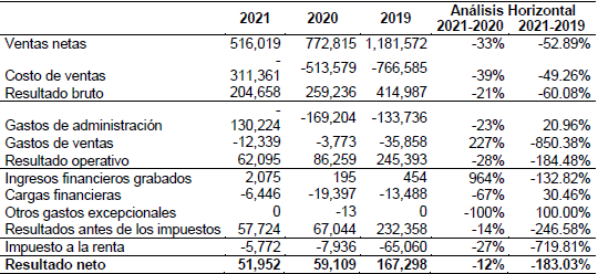 En los estados de resultados de los periodos 2021, 2020 y 2019. se presenta el análisis horizontal, donde se puede observar en el periodo 2021, hubo una disminución de 33 % de ventas netas, respecto al periodo 2020. de la misma manera se observa que hay una disminución considerable del 2020 respecto al año 2019, en cuanto a los gastos administrativos hubo un gasto menor en 23%, en comparación al periodo 2020; Por otra parte, en cuanto a los gastos de venta hubo un aumento en 227%, en cuanto a los resultados del ejercicio del periodo 2021 hubo una disminución al respecto del 2020 en un 12%.