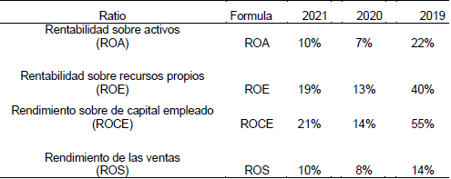 En el índice de las ratios se ha obtenido mediante las fórmulas financieras aplicadas, con respecto a ROA para el año 2021, 10%, 2020, 7% y 2019, 22% respectivamente. Además, se observa un ligero aumento de rentabilidad de 3% mayor respecto al año 2020 y en respecto al año 2019 una reducción de 12% en la rentabilidad sobre los activos empleados por empresa para generar utilidades. En cuanto a la segunda dimensión ROE los resultados son en el año 2021, 19%; 2020, 13% y 2019, 40% comparativamente, donde obtuvieron mayor nivel en 2019 que es de 40%, mientras los años siguientes disminuyeron considerablemente principalmente en 2020, en un 27% menos. A ello se suma el estado de emergencia sanitaria y otras deficiencias internas. En el tercer indicador ROCE, se muestra los resultados 2021, 21%; 2020, 14% y 2019, 55%, donde se observa que en el año 2019 se realizó una buena inversión del capital empleado. Finalmente, en el último indicador ROS, donde se midió el índice sobre las ventas donde se observa, para 2021, 10%; 2020, 8% y 2019%, 14% respectivamente, donde hubo mejores resultados es en el periodo 2019, y de esta manera se determina. que en el periodo 2019 y obtuvieron los mejores resultados.