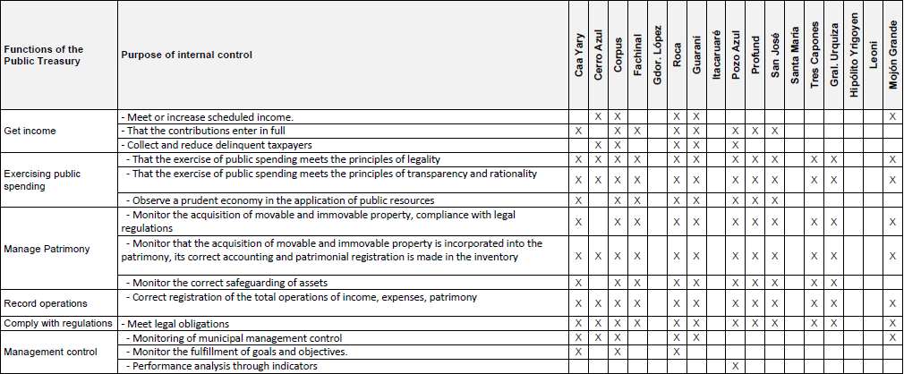 Also, the purpose of internal control in relation to public finance functions was specifically analyzed, asking a set of questions with non-exclusive multiple response options, on the following topics: a) obtaining income; b) execution of political spending; c) asset management; d) registration of operations; e) regulatory compliance; and f) management control.