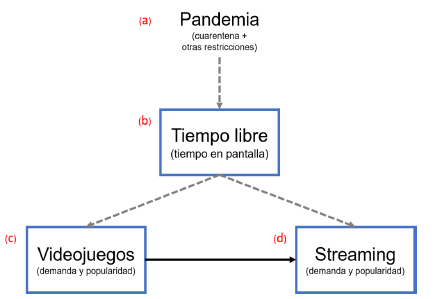 En impacto de la pandemia en las plataformas de streaming se dio principalmente a través de una mayor disponibilidad de tiempo libre por parte de las personas que, a su vez, tenían a los dispositivos digitales entre las pocas fuentes de entretenimiento a su disposición dentro de sus casas. Es decir, como se observa en el gráfico 1, la pandemia (a), a través de sus medidas de contención de la propagación del virus, impacta en el tiempo libre (b) de las personas y esto, a su vez (a través de un mayor tiempo en pantalla), tiene un impacto positivo en la cantidad de personas que visualizan las plataformas digitales de entretenimiento en línea; lo que incluye las plataformas de videojuegos (c) y streaming de video online (d).