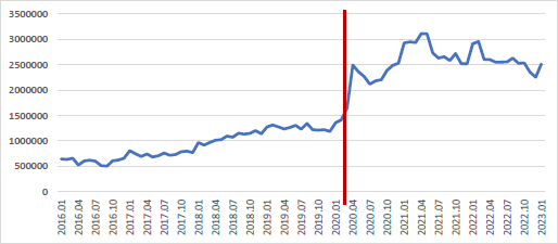Como podemos observar en el gráfico 2, los datos de cantidad de visualizaciones en la plataforma Twitch tienen un notable “salto” en torno al período de referencia de la pandemia. Es decir, las visualizaciones promedio diarias se vieron incrementadas en períodos posteriores a la declaración de pandemia mundial por parte de la OMS (2020.03).