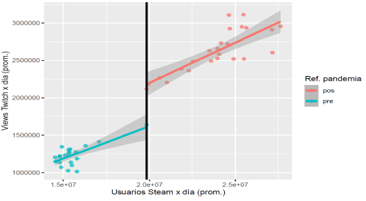 La relación entre las variables STEAMU_A, referida a videojuegos (cantidad de personas conectadas a la plataforma Steam), y la variable de interés VIEWS_A (cantidad de personas concurrentes en la plataforma Twitch), es muy fuerte: VIEWS ~ STEAMU_A, arroja un R2 = 0,9474. Se estable un modelo lineal y se hace un análisis detallado de los residuos del modelo aceptando su independencia, media igual a cero, homocedasticidad y normalidad. No se puede asumir la no autocorrelación de los residuos, algo que puede estar relacionado al uso de series de tiempo, no obstante, gráficamente no se observa un patrón lineal de comportamiento. Por lo tanto, existe una relación directa entre la industria de videojuegos y la plataforma de streaming online Twitch, que desde sus inicios está muy ligada a dicha industria.