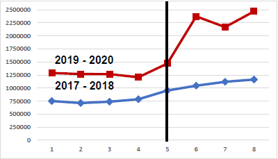 Como se puede observar en el gráfico 4, existe una clara discontinuidad, por lo que podemos decir que la pandemia (2020.03) tuvo un impacto en la cantidad de visualizaciones de la plataforma. Nos queda averiguar cuál es el tamaño de dicha continuidad, lo cual se estima de forma paramétrica y no paramétrica.