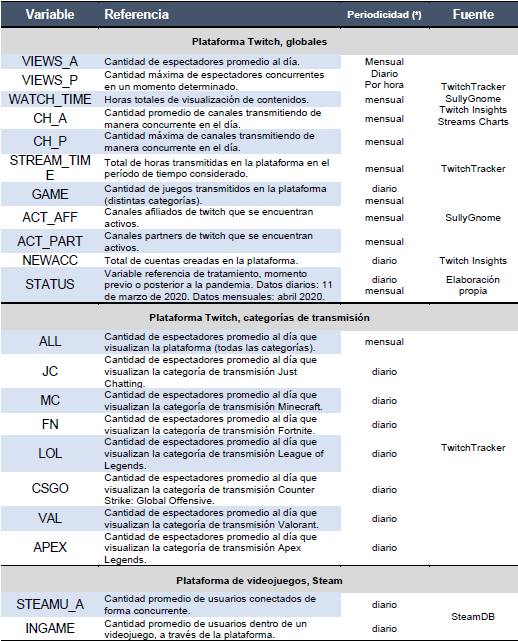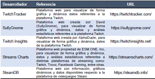 En la tabla 1 se pueden observar las fuentes de información, de desarrolladores reconocidos por Twitch, que se consultaron y de las que se extrajo (de forma manual, no automatizada) los datos de interés referidos a métricas de la plataforma.