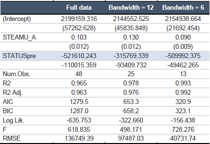 Como se puede observar en la tabla 4, los valores de la discontinuidad de los distintos anchos de banda no difieren mucho; a excepción del año de banda intermedio de 12 meses alrededor de la fecha de la pandemia, la que probablemente por la dispersión de los datos, estima un menor efecto negativo/positivo de la pandemia.